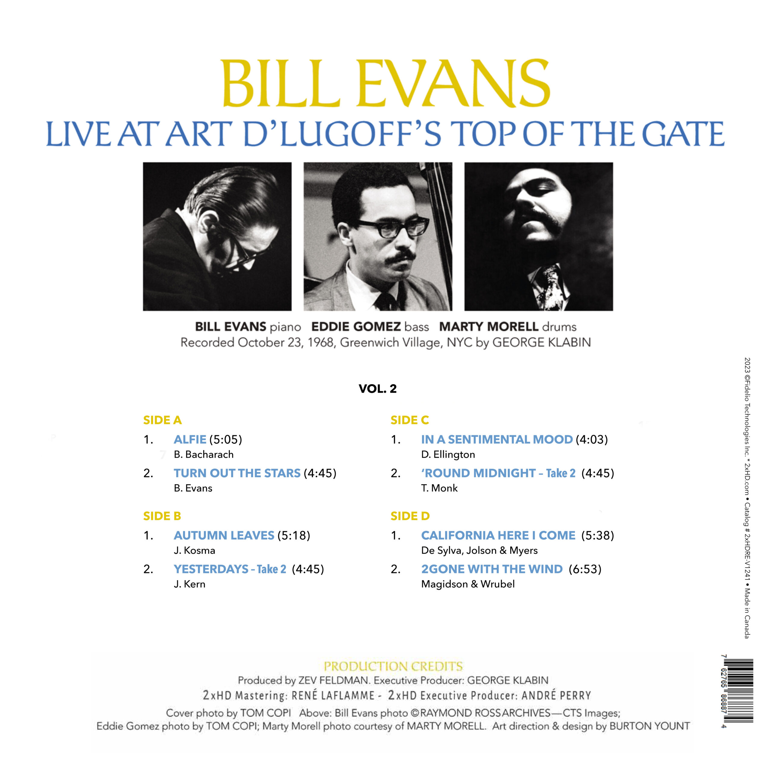 The two volumes capture two complete sets of the Bill Evans trio with bassist Eddie Gomez and drummer Marty Morell on October 23, 1968, at Art D’Lugoff’s legendary Village Gate club in New York City. It’s the only Evans recording released from The Village Gate.